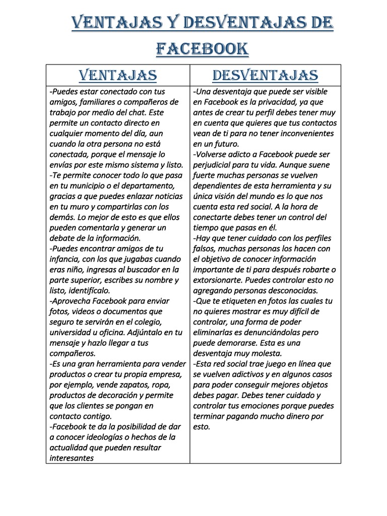 Ventajas Y Desventajas De Facebook Pdf Facebook Servicio De Redes Sociales