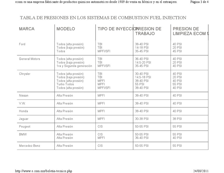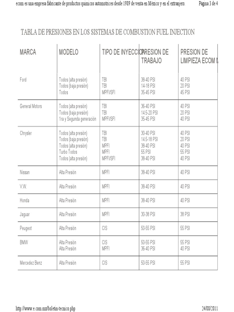 TABLA DE PRESIONES EN LOS SISTEMAS DE COMBUSTION FUEL INJECTION. Ecom es una empresa fabricante de productos quimicos automotrices desde 1989 de.